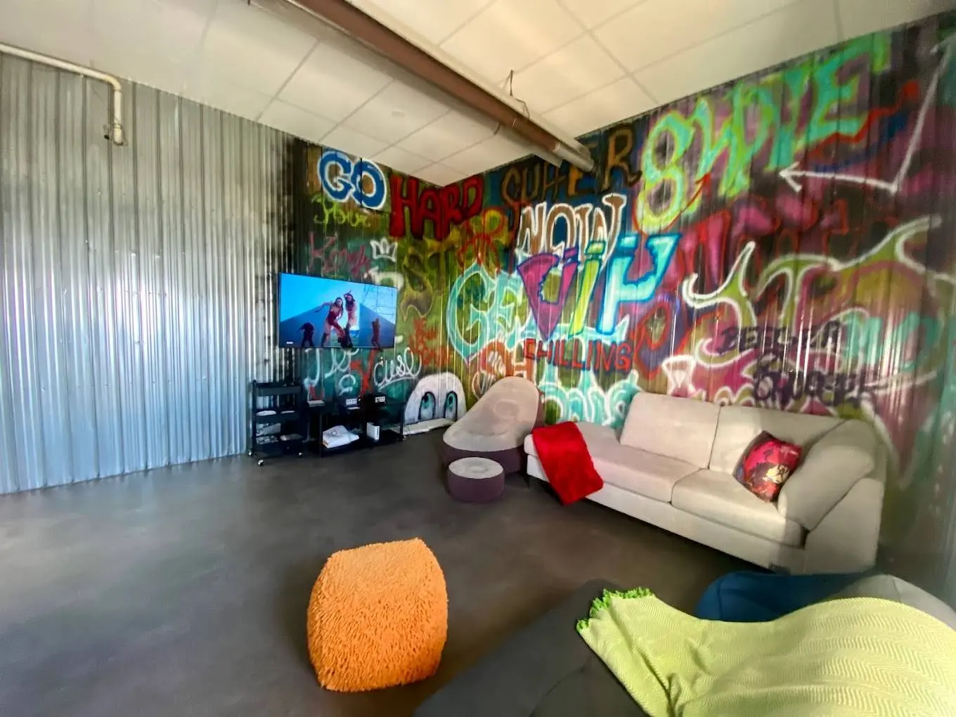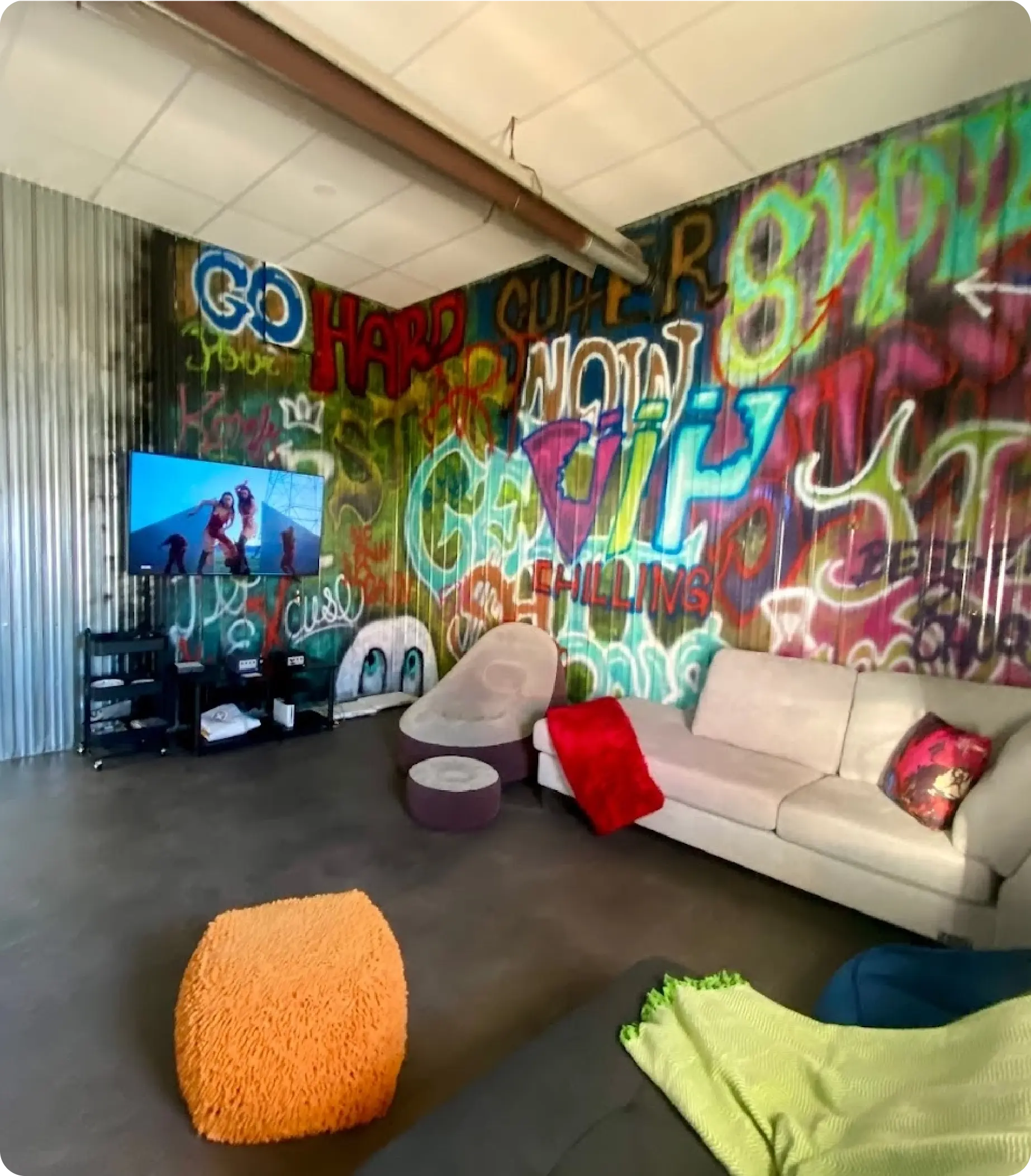 // « Chilling room » avec divans, « bean bags », télé, jeux vidéo et jeux de société